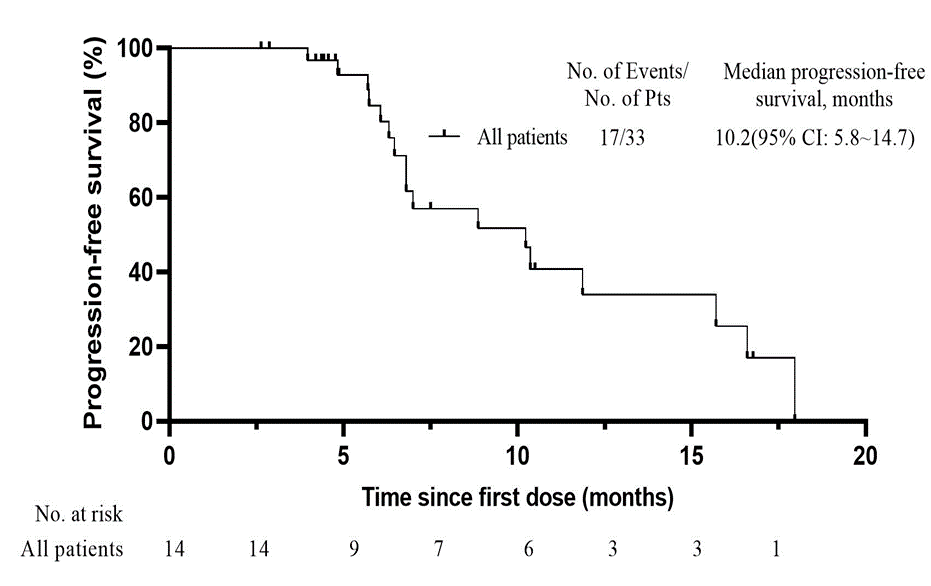 将2020年10月至2023年1月接受阿得贝利单抗联合放化疗治疗的33例ES-SCLC患者纳入研究分析,中位年龄为62岁(38-73岁),其中,28例患者为男性(84.8%),22例患者具有吸烟史(66.7%),32例患者ECOG PS评分为1(97%)。基线时,10例患者存在脑转移(30.3%),10例患者存在肝转移(30.3%)。