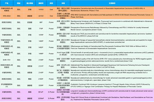 在消化系统肿瘤领域,AG真人平台创新产品相关研究共入选2项口头报告、10项壁报和2项电子壁报,共14项研究。除了明星药物卡瑞利珠单抗和阿帕替尼外,还有5篇阿得贝利单抗治疗消化系统肿瘤的研究入选。此外,HRS-4642、瑞拉芙普-α注射液(SHR-1701)等未上市创新产品也有相应研究入选。随着新老药物前沿研究的不断推进,有望为消化系统肿瘤患者带来新的福音!